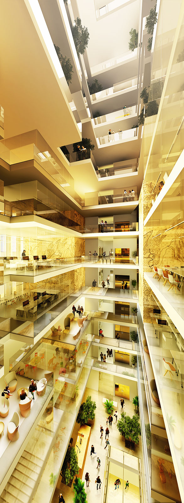 This project is a search for a singular identity using multiple entities. The programmatic objective was to assemble all the various departments of the company, previously housed in separate buildings scattered throughout the city, into one building. In this tower, each department is housed individual volumes which are then stacked to create a vertical community. The different departments are physically and visually linked by the presence of a central atrium which runs through the core of the building. The projects aims to forge an architectural unity and create an urban landmark while still maintaining a strong sense of identity and independence for each department.