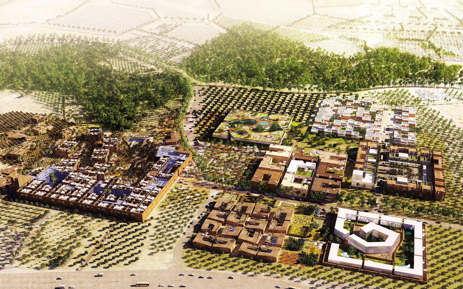 The project for the new development of Bab Atlas on the outskirts of Marrakech adjoins the historic landscape of the famous Palmeraie. Using strategies from agricultural planning, the project is organized on the traces of ancient underground aqueducts and the framework of existing farmlands. The project uses the network of water ways to structure all the elements of the urban plan. At the heart of the site lies the Village in which a series of six citadels is integrated into the agricultural grid of the landscape. Each citadel comprises a small community within a greater network of shared resources and infrastructure. In addition to containing artisan workshops, galleries, hotels, and commercial spaces, each citadel is composed of a different typology of housing.