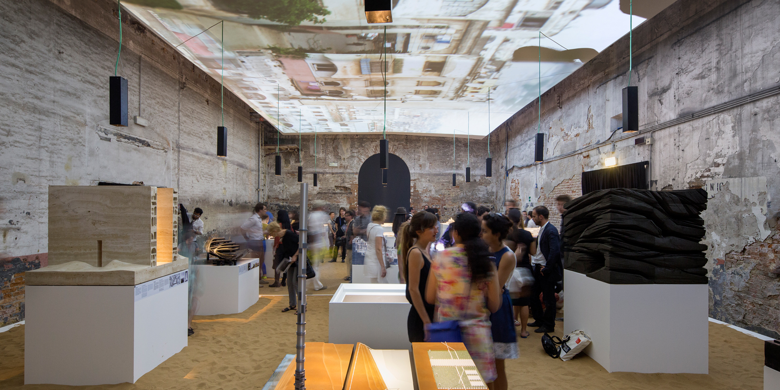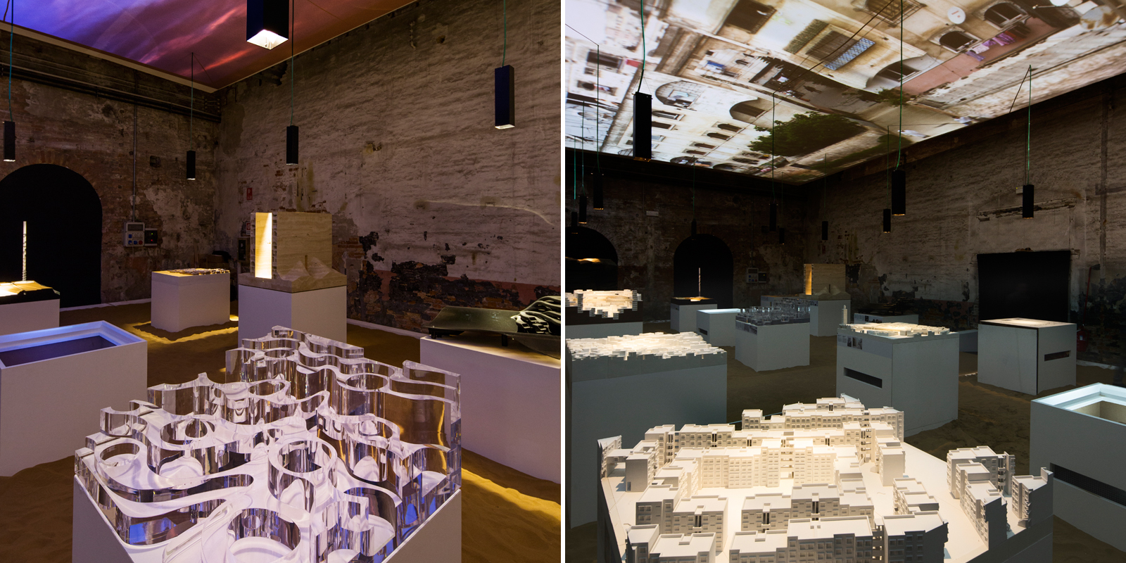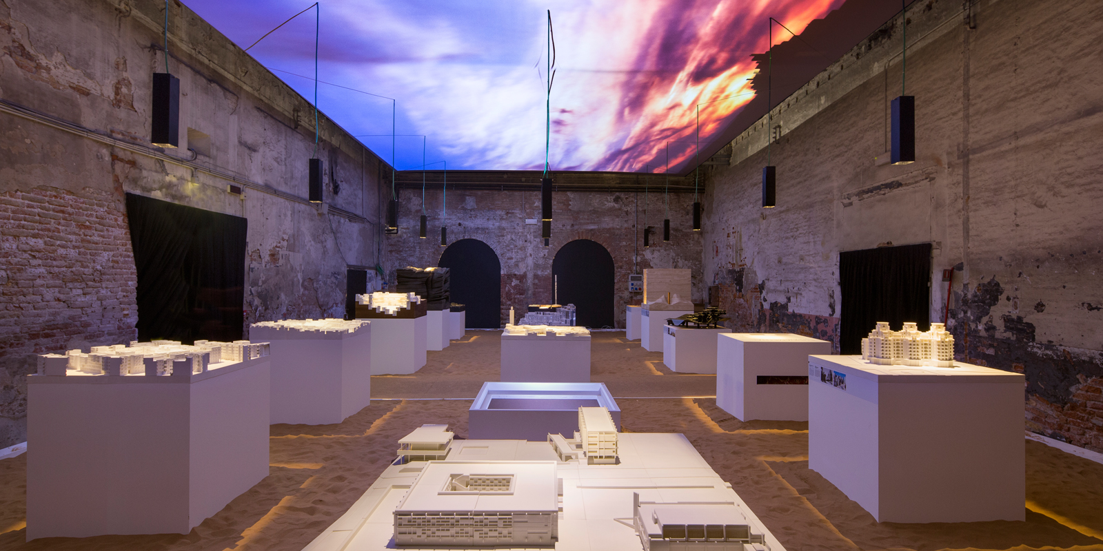 Entitled Fundamental(ism)s in an allusion to the general theme proposed by Rem Koolhaas, the Moroccan Pavilion explores the radical and experimental approaches inspired by the region. The exhibition focuses on the fundamental question of habitation and juxtaposes a historical trajectory of modern urban housing with contemporary speculations on inhabitable structures in the desert. The unique geography of the Moroccan Sahara and its position as a territory at the “limits”, in a climatic, social, and political sense, demands that architects question how to integrate architectural and infrastructural solutions into such a marginalized territory. In the pavilion, the projects are displayed on steles that emerge from a sea of sand. Like a celestial vault, a 120-square-meter screen suspended above the sand projects two sequences that trace the course of a single day. Cycling through the current state of the historical buildings presented in the exhibition, the film is in equal measure texture, light, and narrative