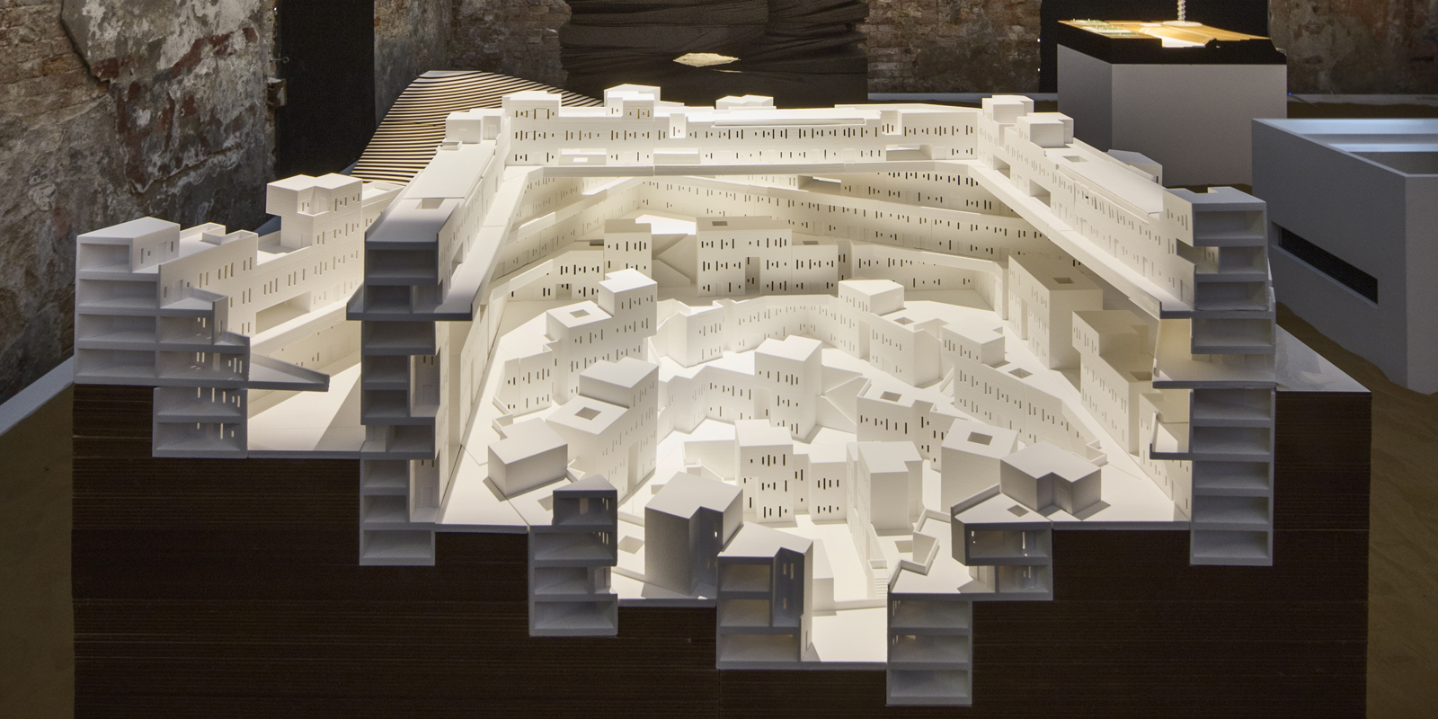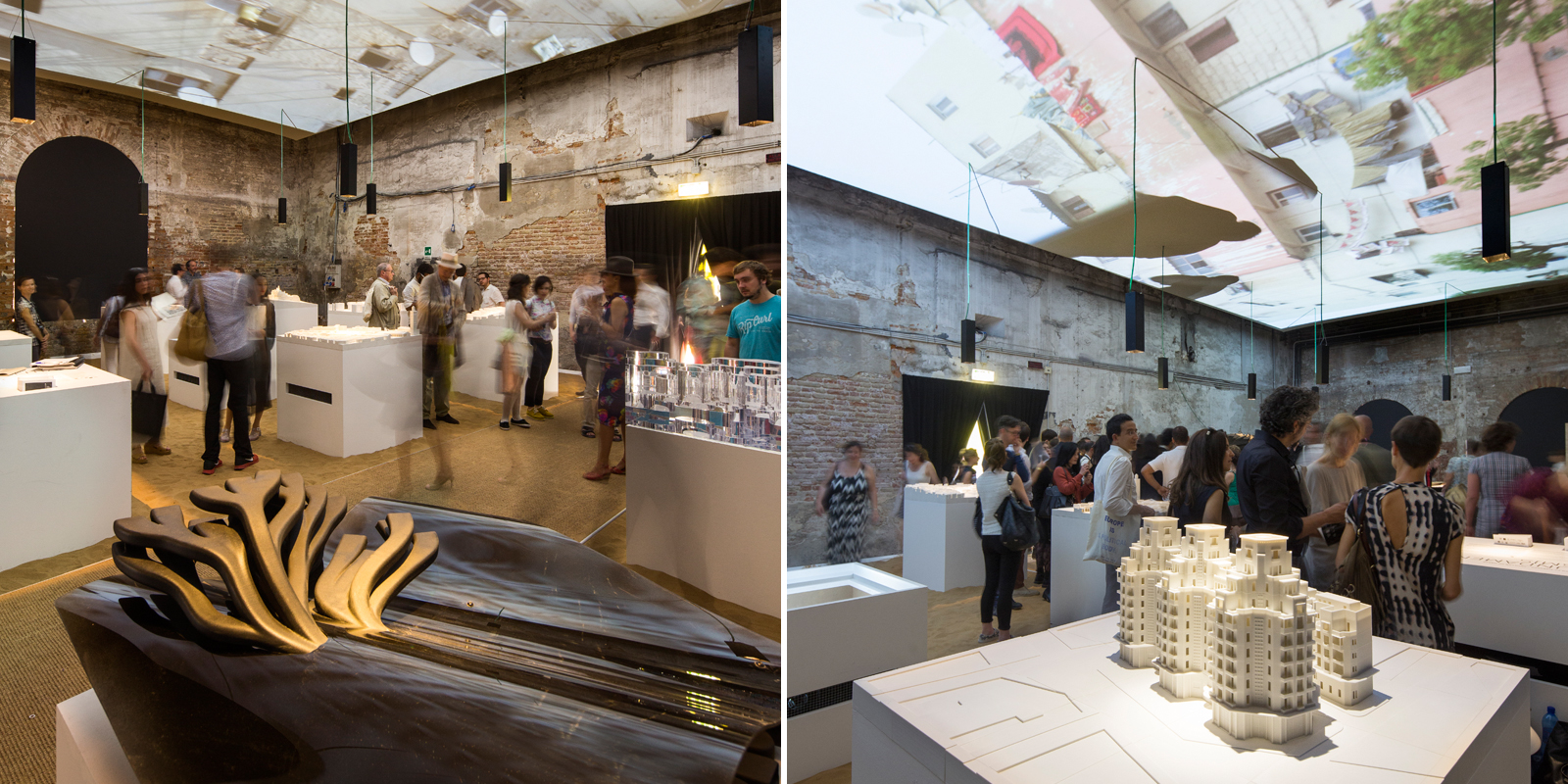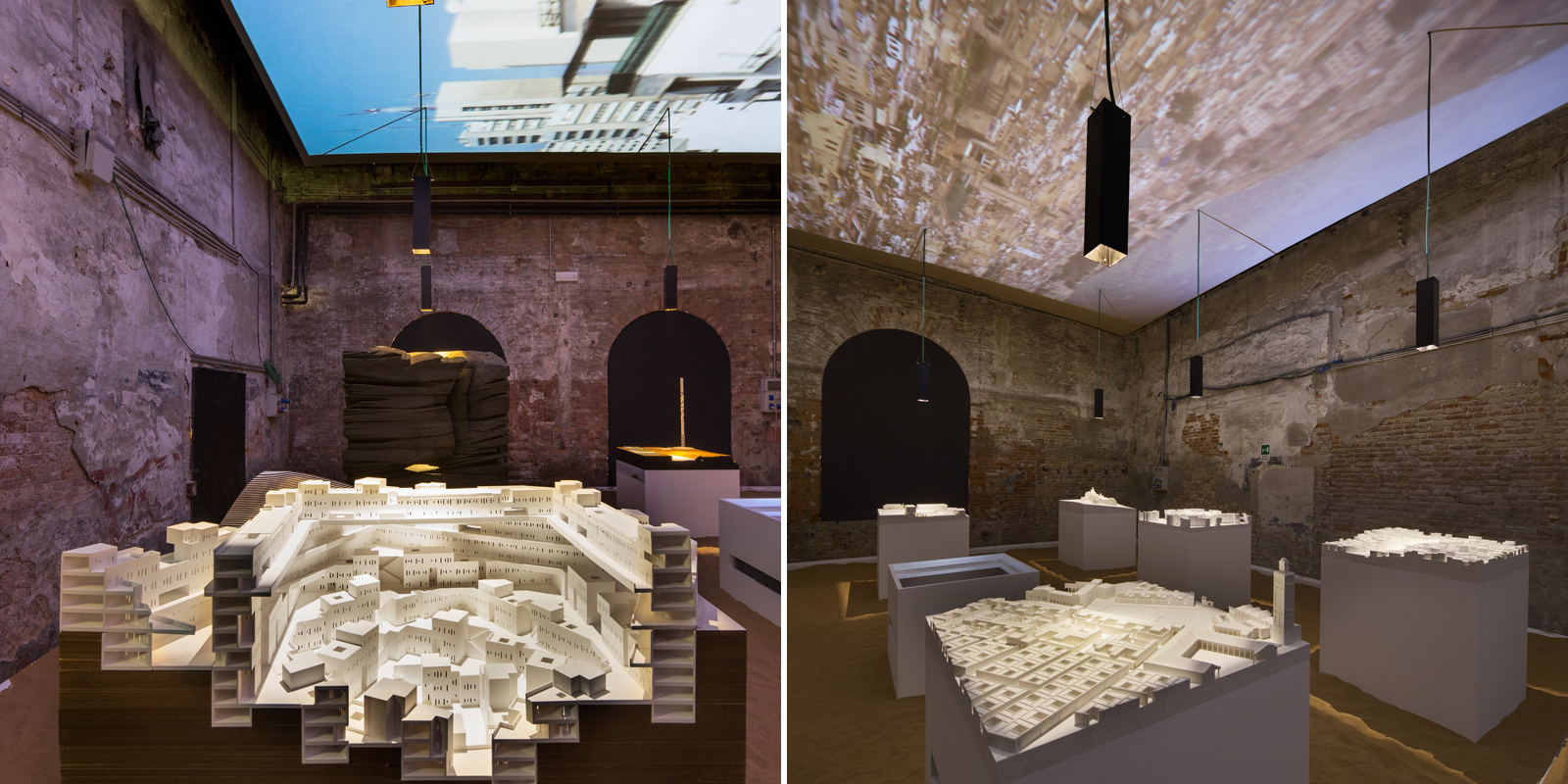 Entitled Fundamental(ism)s in an allusion to the general theme proposed by Rem Koolhaas, the Moroccan Pavilion explores the radical and experimental approaches inspired by the region. The exhibition focuses on the fundamental question of habitation and juxtaposes a historical trajectory of modern urban housing with contemporary speculations on inhabitable structures in the desert. The unique geography of the Moroccan Sahara and its position as a territory at the “limits”, in a climatic, social, and political sense, demands that architects question how to integrate architectural and infrastructural solutions into such a marginalized territory. In the pavilion, the projects are displayed on steles that emerge from a sea of sand. Like a celestial vault, a 120-square-meter screen suspended above the sand projects two sequences that trace the course of a single day. Cycling through the current state of the historical buildings presented in the exhibition, the film is in equal measure texture, light, and narrative