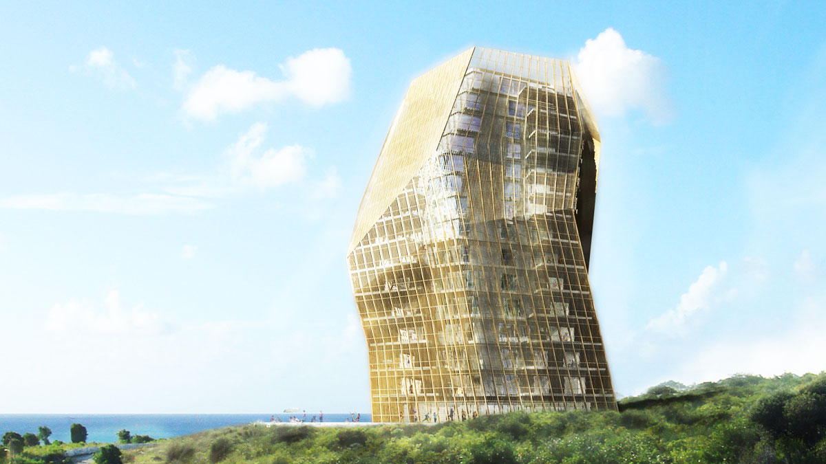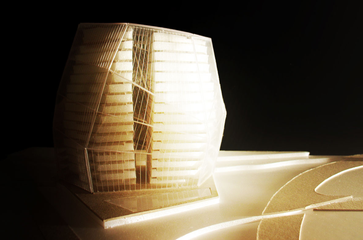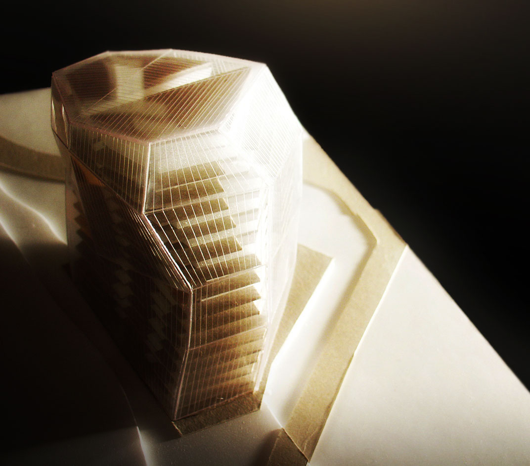 The significance of the Cupecoy tower’s site derives from its presence at the border of the French and Dutch territories on the island, as well as its adjacency to the sea and the historic Slave Wall. Our intention was to create a landmark building whose volumetric inflections would respond to these various site conditions. The building, the tallest to be built on the island, metamorphosizes from a state of inhabitation to non-inhabitation as the elevation transforms and reveals the peculiar temporality of resort housing. When closed and unoccupied (the majority of the year), the building sustains a sculptural, totemic presence; when open, the projecting shutters of the façade generate a complex play of light and shadow on the façade which exhibits the level of inhabitation within.