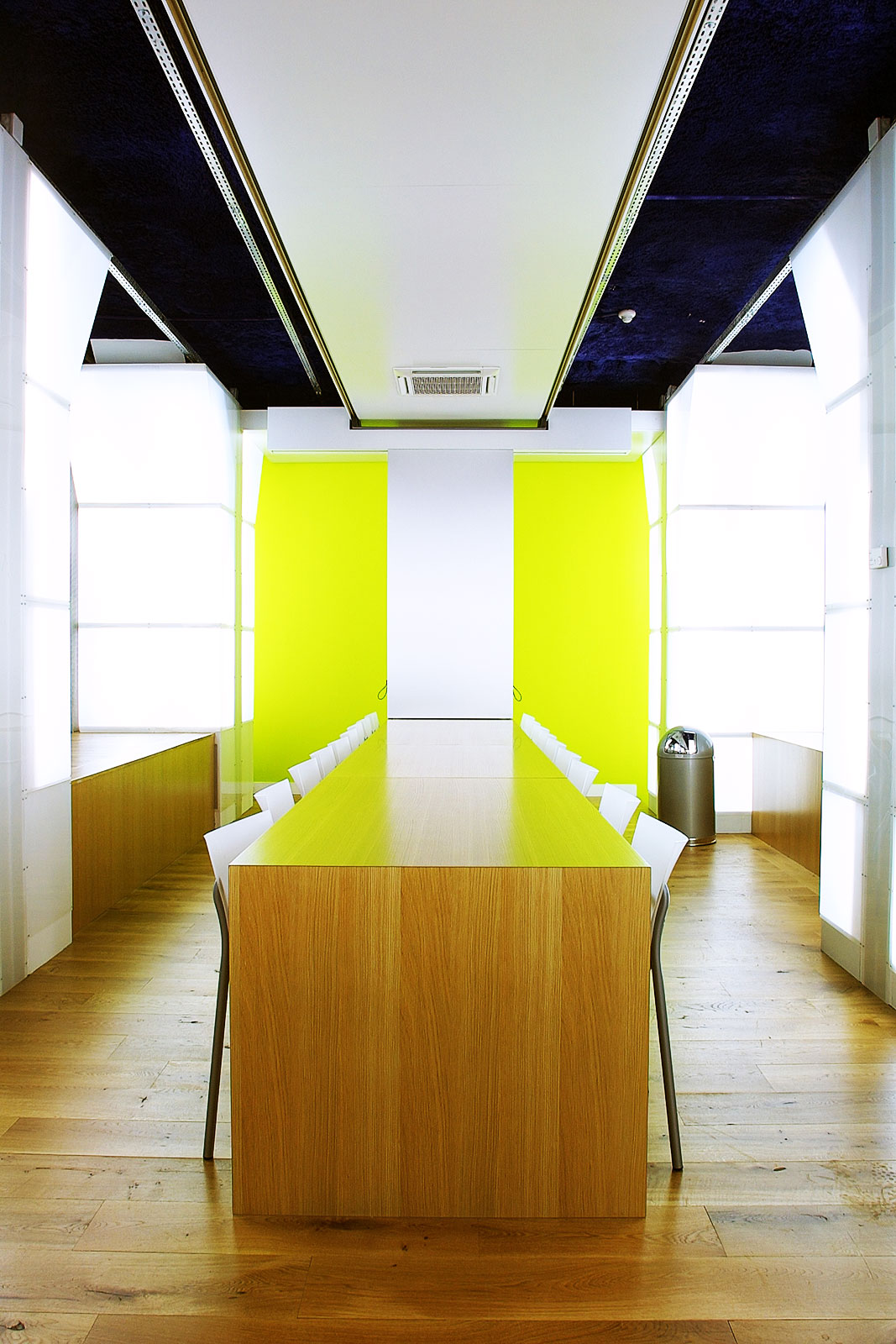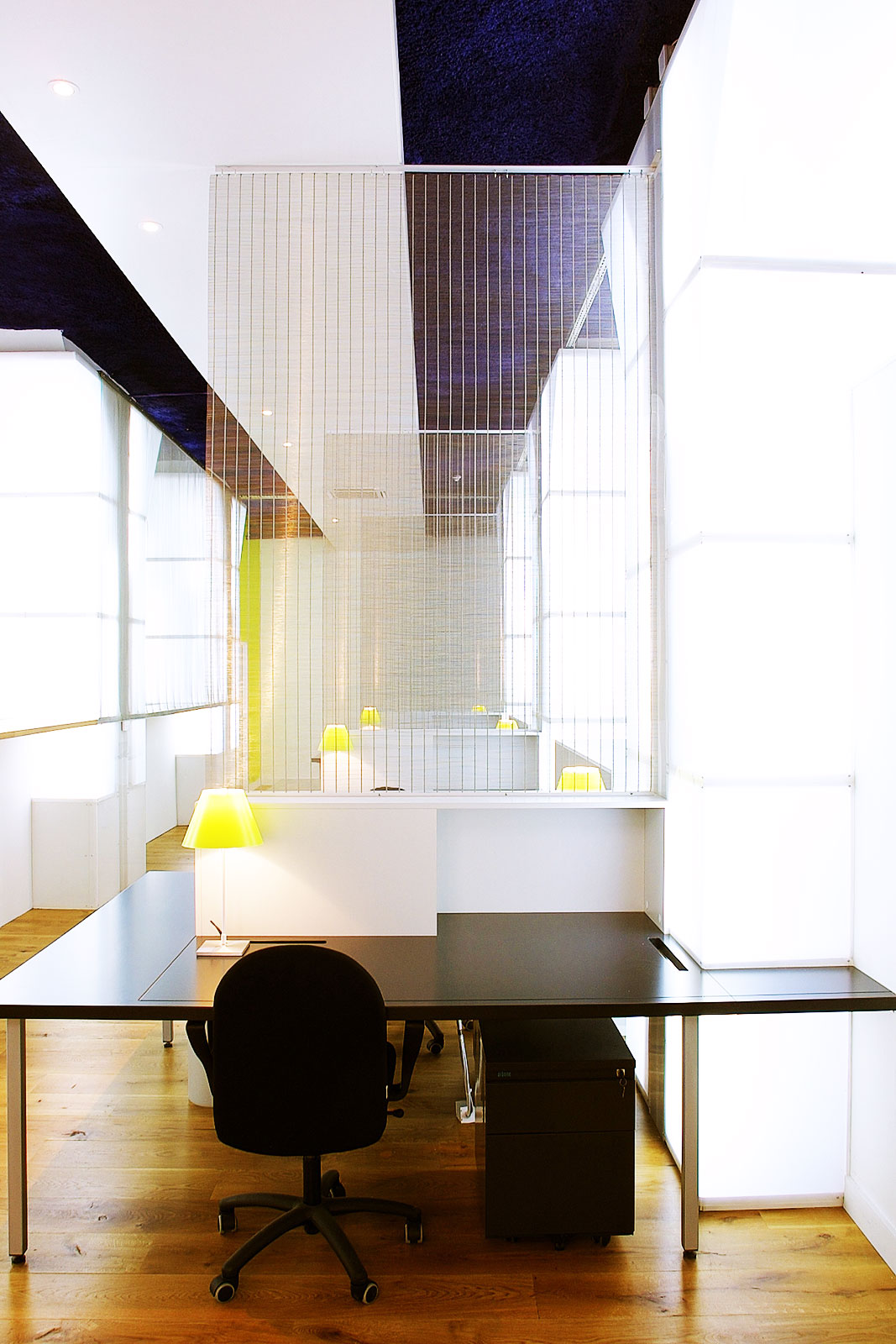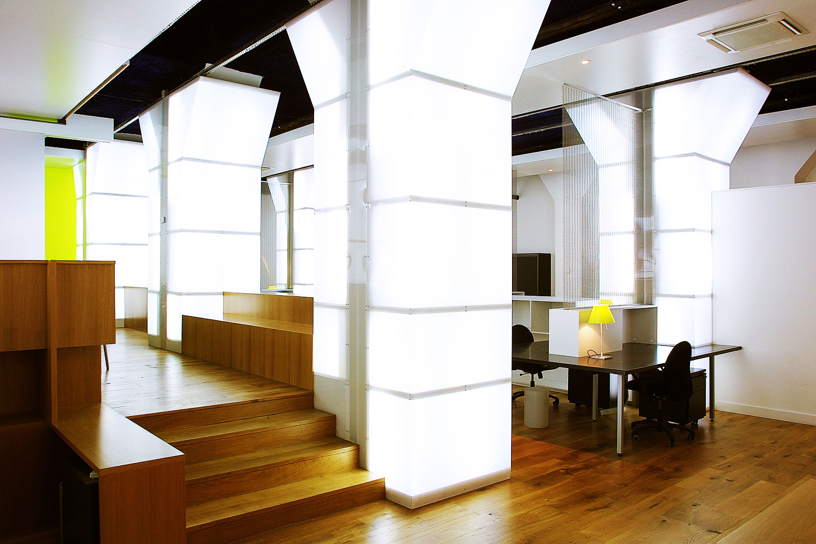 Located in a 19th century warehouse near the Seine, this project posed multiple infrastructural challenges. The clients, specialists in information technology, requested offices for 30 executive consultants. Due to the difficulties posed by a low ceiling, lack of natural daylight, and the weighty presence of the covered structural columns in the space, the standard solutions for office infrastructure were not an option.