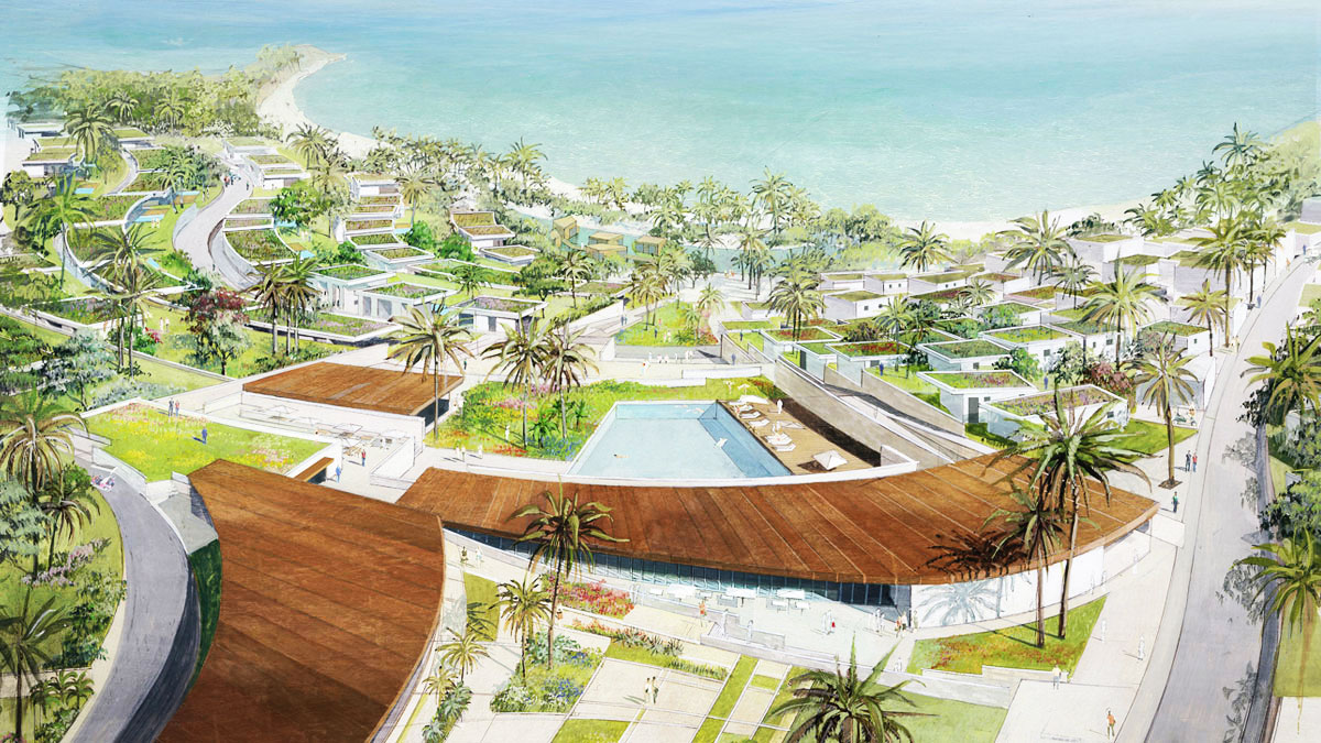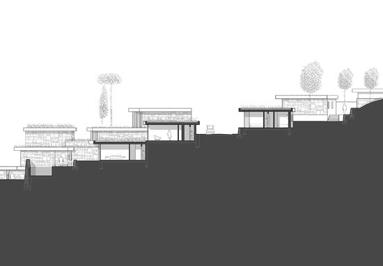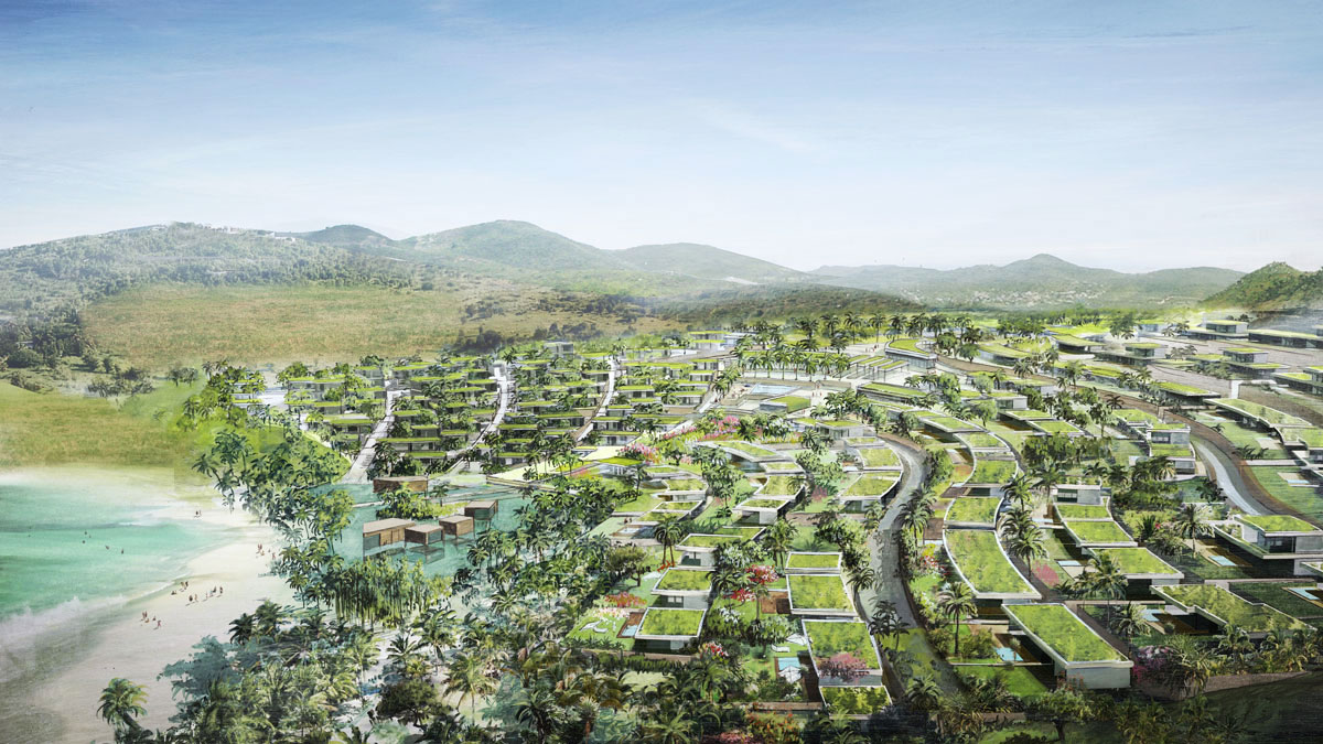Happy Bay is located on the French portion of the island of Saint Martin, 4 km from Marigot. In this idyllic locale, the project draws inspiration from the hanging gardens of Babylon, nestling its 80-room hotel and 80 private villas in a series of planted platforms that dovetail with the existing topography. Large stone retaining walls structure the site vertically, while planted roofs extend over the entirety of the complex, giving the site, when viewed from above, the appearance of a work of nature.