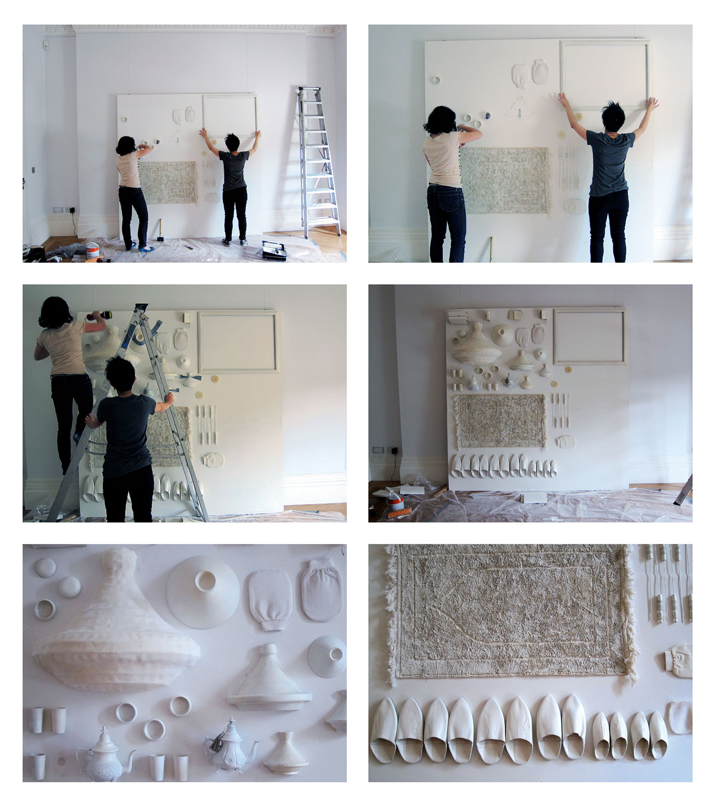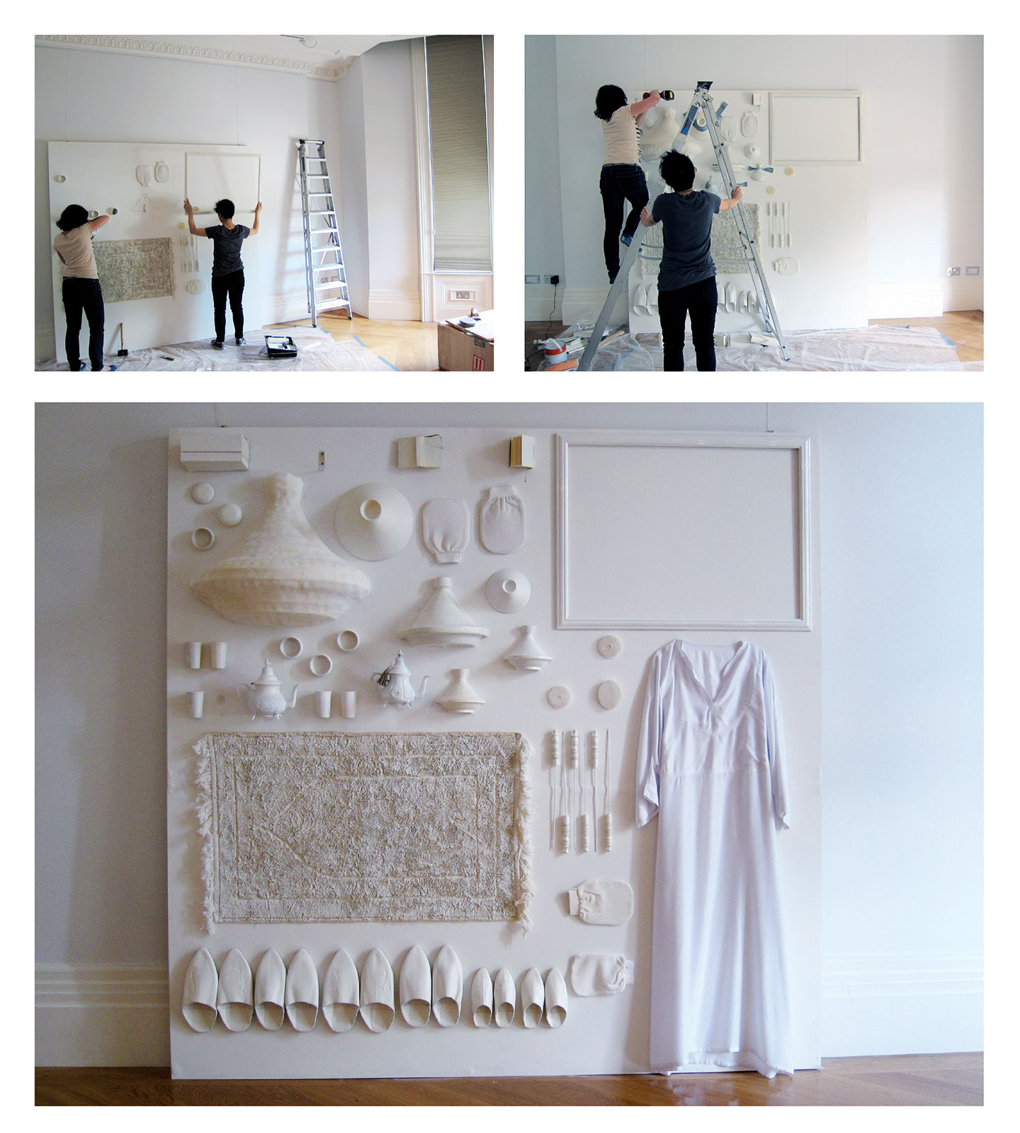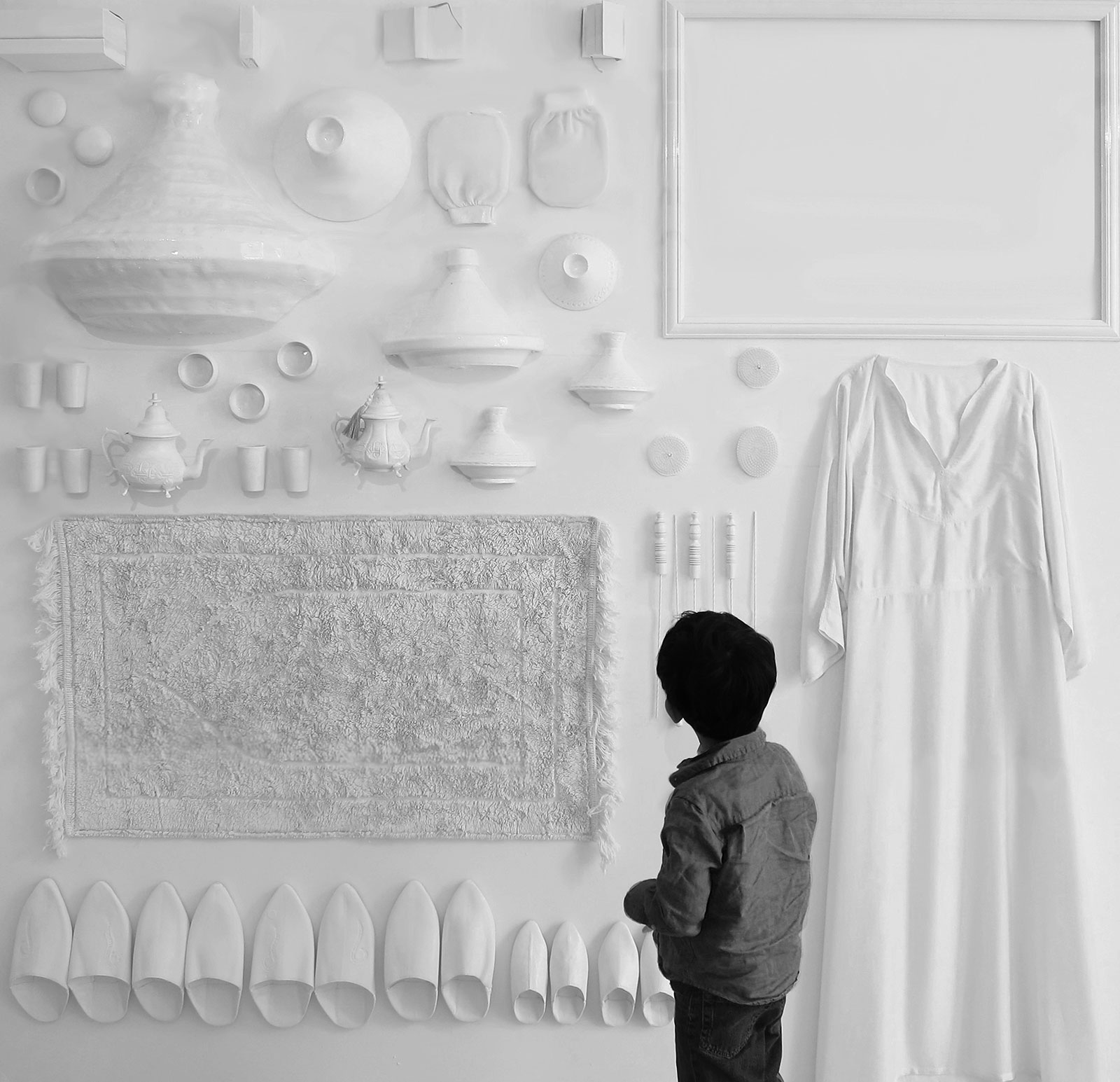 Cette exposition, organisée par le Musée d’Architecture de Londres, avait pour ambition de mener un travail d’investigation autour des espaces domestiques dans un univers mondialisé. Le commissariat a décidé de laisser libre cours aux architectes sélectionnés d’offrir une réflexion sur l’identité et le rapport à la domesticité. Dans cette optique, nous avons pris le parti de mettre en place une installation dédiée à la question de la diaspora. La mobilité étant au cœur de la problématique, nous avons fait le choix de ne pas présenter de dispositifs architecturaux domestiques, mais une collection d’objets transportés. Présentée sur un même plan, monochrome, l’installation déploie tous les objets qui fabriquent la domesticité, le tout devenant une surface de projection en reliefs, pour les témoignages apportés par les marocains du monde.
