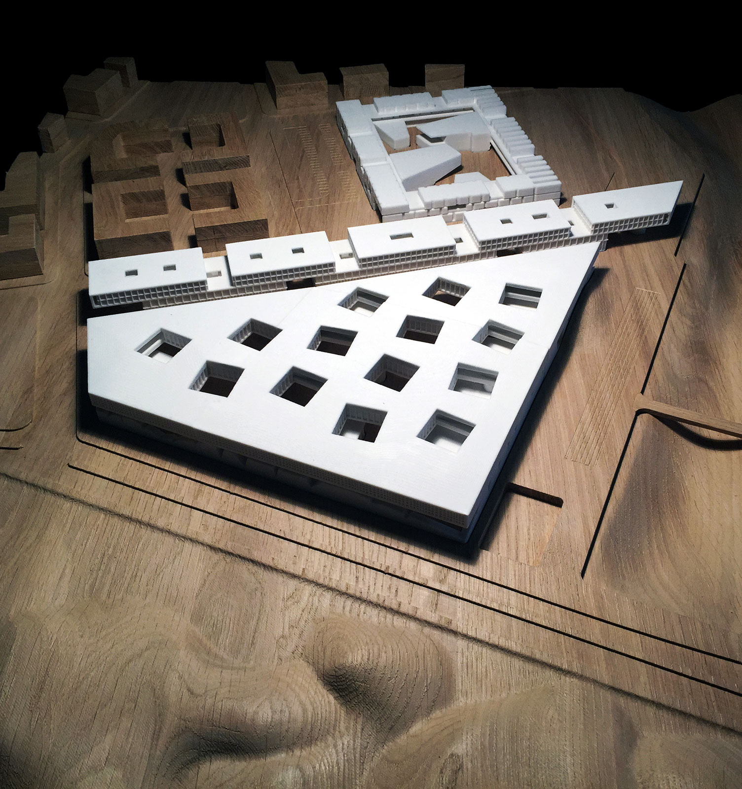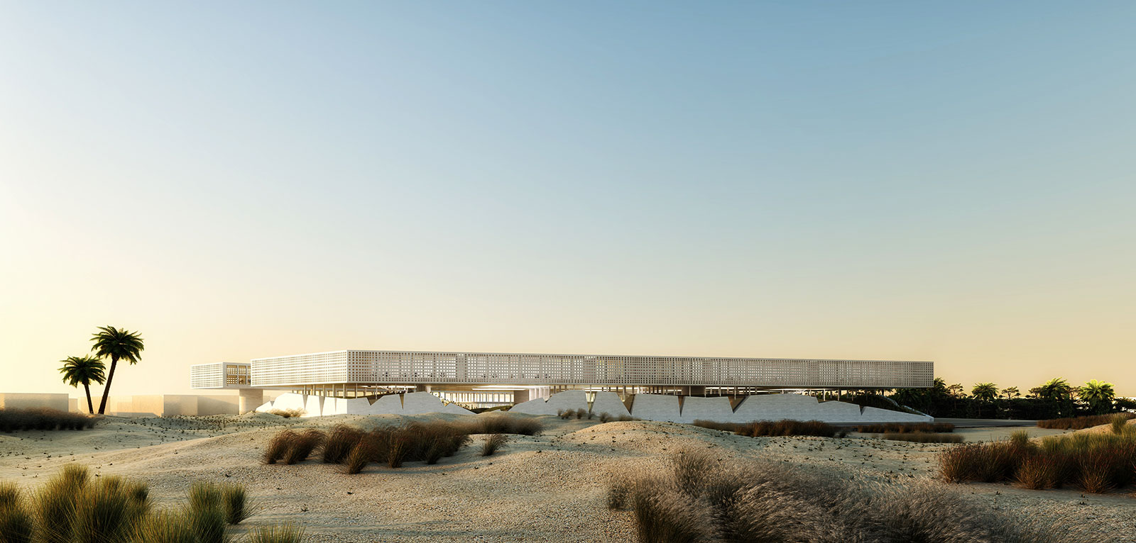 Construire un lycée dans le désert, à la lisière d’un fleuve asséché sur un territoire encore vierge d’urbanisation, a été l’occasion d’explorer des formes extrêmes d’habitabilité. Le bâtiment est un « toit », une plaque suspendue à dix mètres du sol, qui fabrique et protège un nouveau paysage. Sur ce dernier, on retrouve l’ensemble des espaces publics et communs, tandis que la plaque surélevée abrite les espaces pédagogiques. Ici l’architecture est pionnière et protectrice, primitive et radicale. Elle protège le paysage et les usages, elle rend possible ce nouvel établissement territorial. Entre infrastructure et superstructure, l’échelle du bâtiment n’a d’autre repère que le paysage.