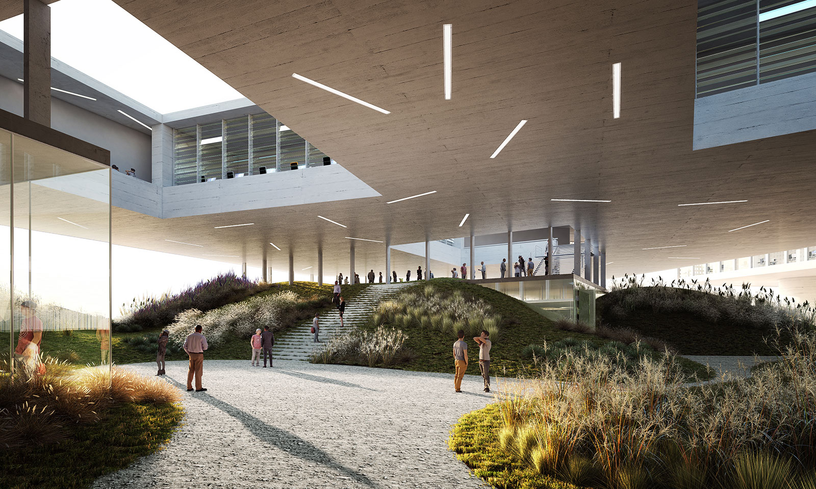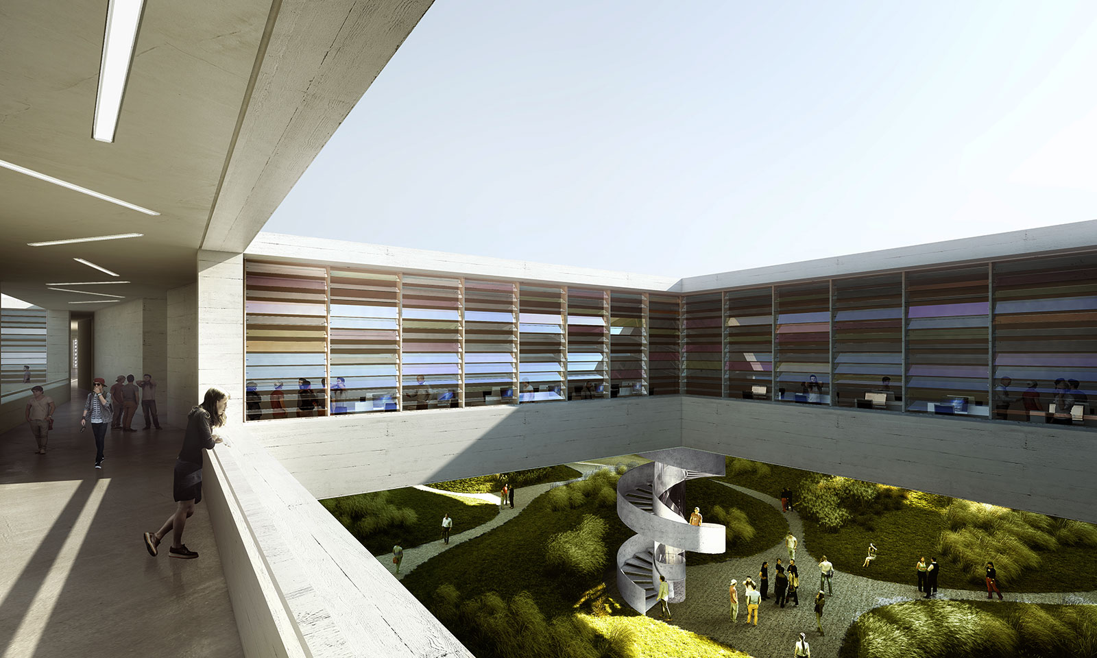 Suspending the building above the ground allows for the creation of an outdoor campus in a climate which would other wise be too hostile for exterior gathering spaces. Public programs and gathering spaces, such as the amphitheater, restaurant, and gymnasium, are grouped together on the shaded ground level. The academic center – classrooms, laboratories, and workspaces – are placed in a single story volume which is suspended above the public ground. Academic spaces are organized around a series of patios that provide daylight and allow for the natural ventilation of spaces. Passive bioclimatic solutions are coupled with innovative technologies in order to achieve a building that maximizes energy performance with minimal environmental impact.