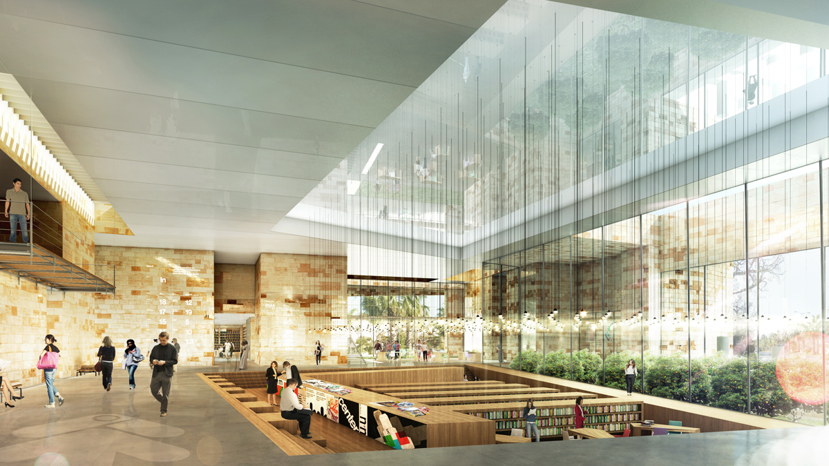 The project of the new Khouribga Médiathèque is a study of an architecture of removal, an architecture that comes from carving out of a monolithic mass. Each department of the médiathèque develops within its own distinct mineral and crystalline form, each deployed at the periphery of the site so as to create an identifiable and strong urban presence. The program is carved out to offer differentiated yet continuous spaces that are functional yet qualitative. The ensemble of crystals are linked by a large and flexible common space, that creates a centrality to the project where all lives, services, and functionality inherent in a médiathèque can meet. Each separate department has its own dedicated patio/garden space, recreating a program-specific and building-contextual rapport of nature, offering serene and peaceful exterior spaces in relation to their interiors.
