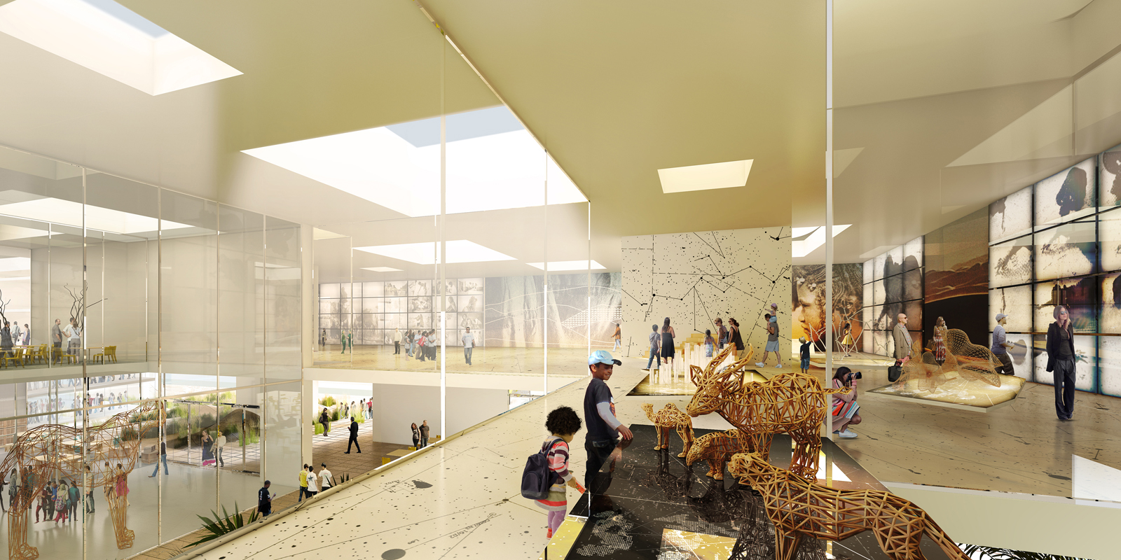 The sea of sand turns the desert into a territory without a ground. Constantly shifting, the ground is never a point of reference; like sailors, the inhabitants of the desert rely on the constellations as the only stable geographic guides. Suspended between this shifting ground and the infinite sky, the floating volume of the Dakhla Museum traces the histories and cultures of the peoples of the desert. In this extreme climate, the hovering volume shelters a shaded public plaza and garden, upon which the museum’s public entities are located. The path to the museum circles around the temporary exhibition space which floats between the public plaza and the museum proper. Inside the museum, the experience is fabricated like a constellation, a non-linear experience which groups and re-groups objects into multiple narratives.