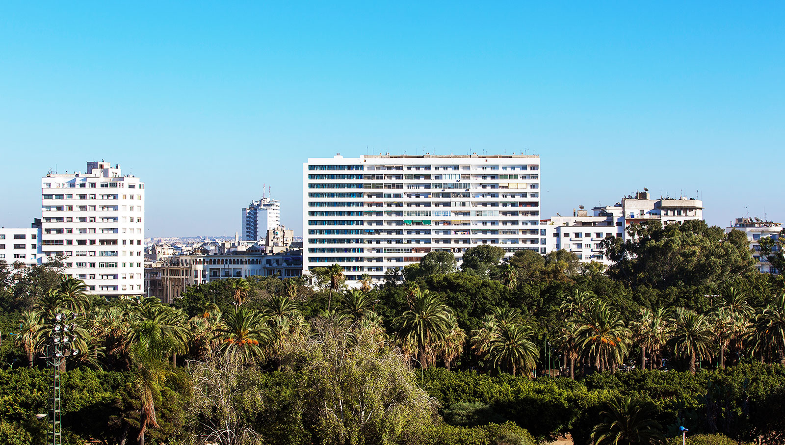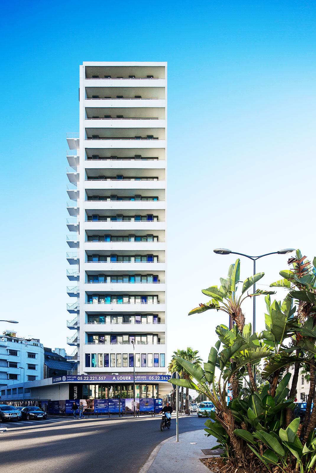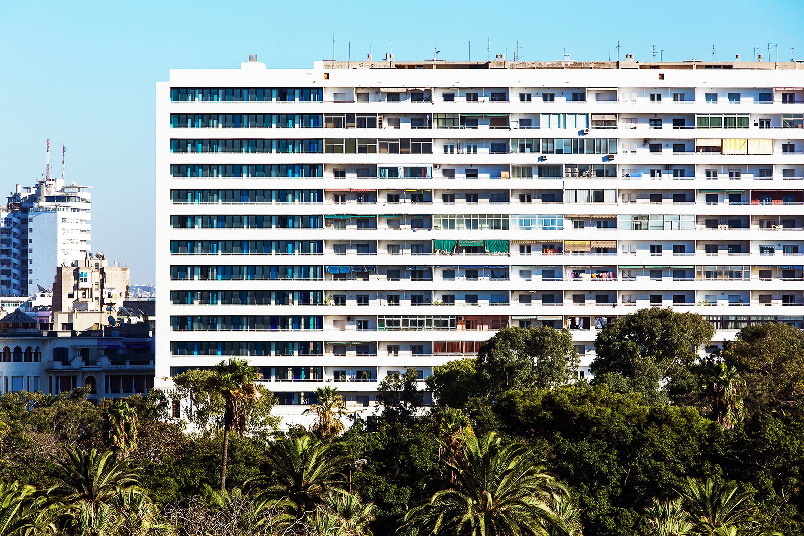L’immeuble des Résidences du Parc, construit par Alexandre Courtois en 1 954, surplombe le P arc de la Ligue Arabe. Véritable archétype de barre Casablancaise des années 50, le bâtiment, à l’intersection de deux des avenues les plus importantes de la ville, s’est lentement dégradé au fil du temps. La transformation consistait à retravailler la partie la plus noble et la plus visible de la barre, d’en changer les usages et d’en réinterpréter la façade. L’enjeu était de transformer sans pervertir, d’utiliser la façade comme un canevas, d’en exacerber le rythme sans brouiller la lecture. Véritable exercice d’intervention sur le patrimoine du 20ème siècle, le projet des Résidences du P arc propose des modalités nouvelles pour investir, valoriser mais aussi célébrer ce patrimoine architectural casablancais.