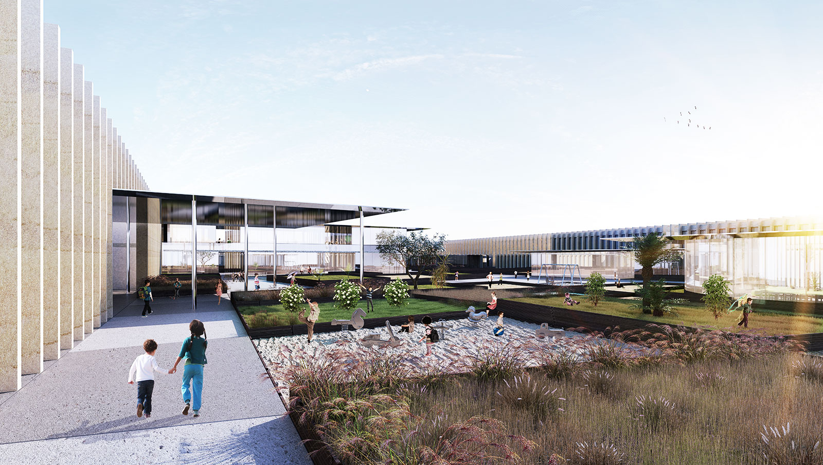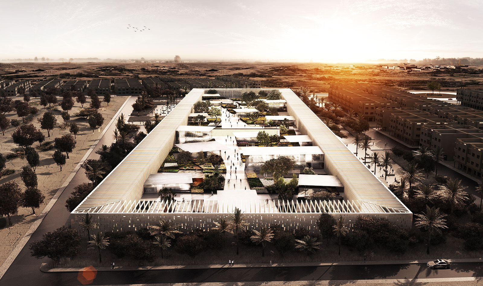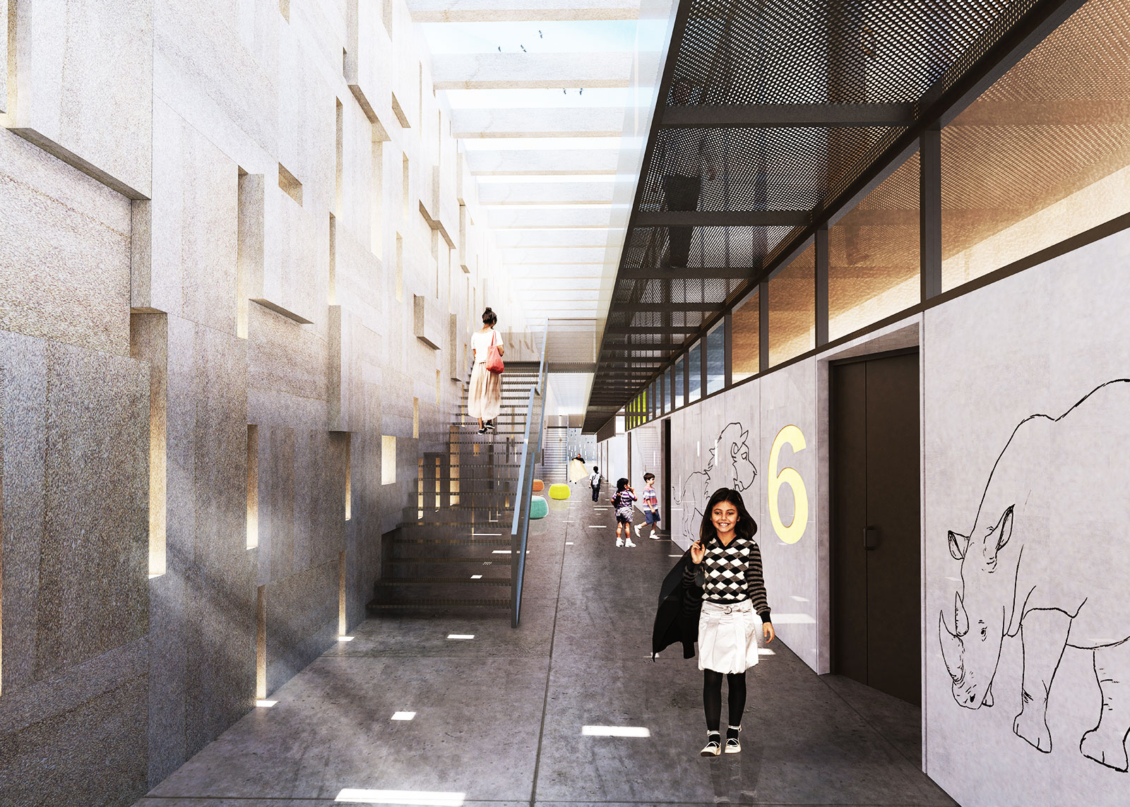 Dans un territoire urbain, délité et détérioré, le projet crée sa limite avec l’espace public, il investit l’épaisseur de son périmètre pour y installer un programme scolaire allant de la crèche au lycée. À la fois solide et poreux, ce mur habité protège un grand parc intérieur dans lequel s’organisent tous les programmes à vocation publique ainsi que les équipements sportifs. Ce cœur paysager vient s’étendre au-delà du contour du bâtiment offrant au quartier un espace public de qualité tout en valorisant l’équipement. Figure linéaire et unificatrice, la façade est rythmée par une agrégation de volumes en béton, qui tout en filtrant la lumière, permet de créer un climat agréable et tempéré.