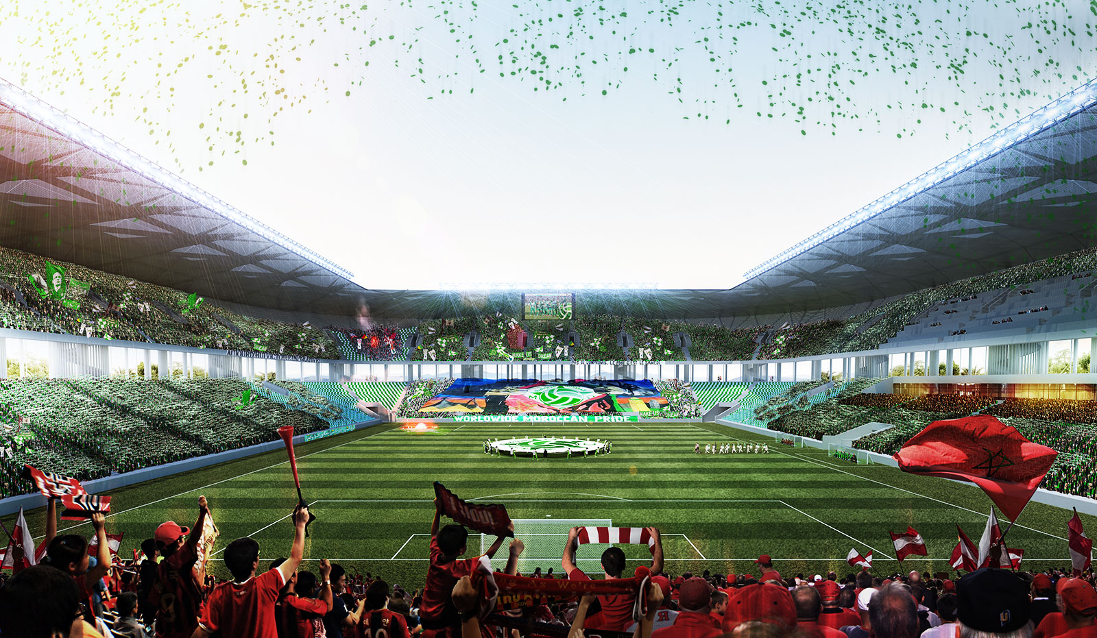 The upper bowl of the stadium is suspended above the ground while the lower bowl is integrated into the ground. This creates a void between the two bowls which allows the landscape to pass through the stadium. This space between the two bowls becomes an agora, a public space of perambulation and interaction.