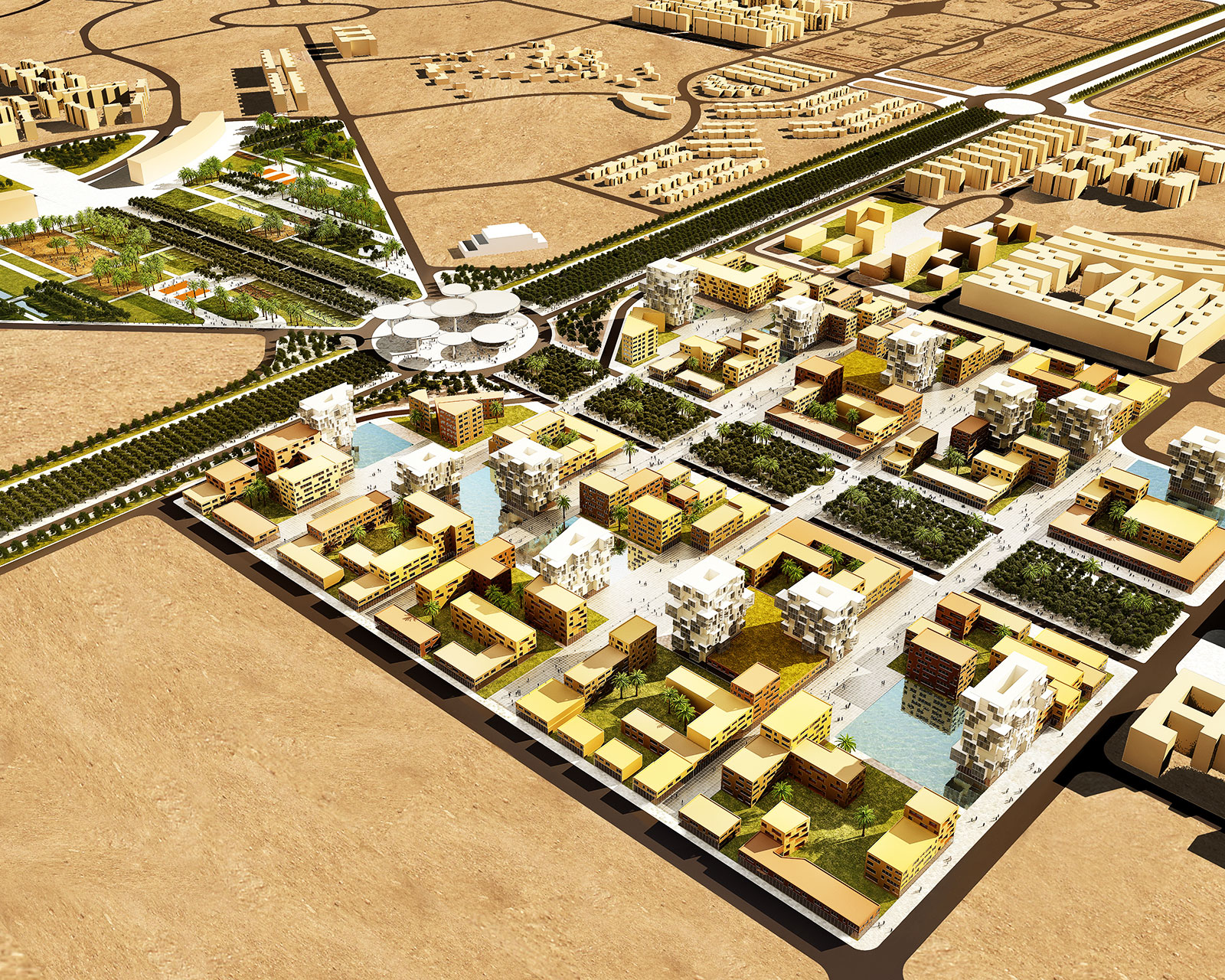 Le projet d’aménagement de Tamansourt s’inscrit dans la stratégie de développement du Grand Marrakech. Au-delà de la conception d’une ville nouvelle, l’enjeu est de développer un territoire cohérent, dont l’identité ne se limite pas à la dépendance à la grande ville. Si sa relation affirmée avec Marrakech est évidente, nous envisageons cet aménagement comme l’opportunité de développer un nouveau centre d’activité tertiaire, limita nt la mobilité et renforçant l’attractivité de Tamansourt. La composition urbaine s’articule autour d’îlots traversés dont la profondeur génère de l’espace public privilégié, tout en y intégrant une diversité de programmes. Cet aménagement d’îlots mixtes élabore un jeu de densité et de morphologie, tout en offrant d’amples espaces déambulatoires et une porosité visuelle à l’échelle de la ville. Les grands axes préexistants bénéficieront d’un traitement paysager qui ralentira la circulation pour que Tamansourt ne soit plus qu’une cité traversée.