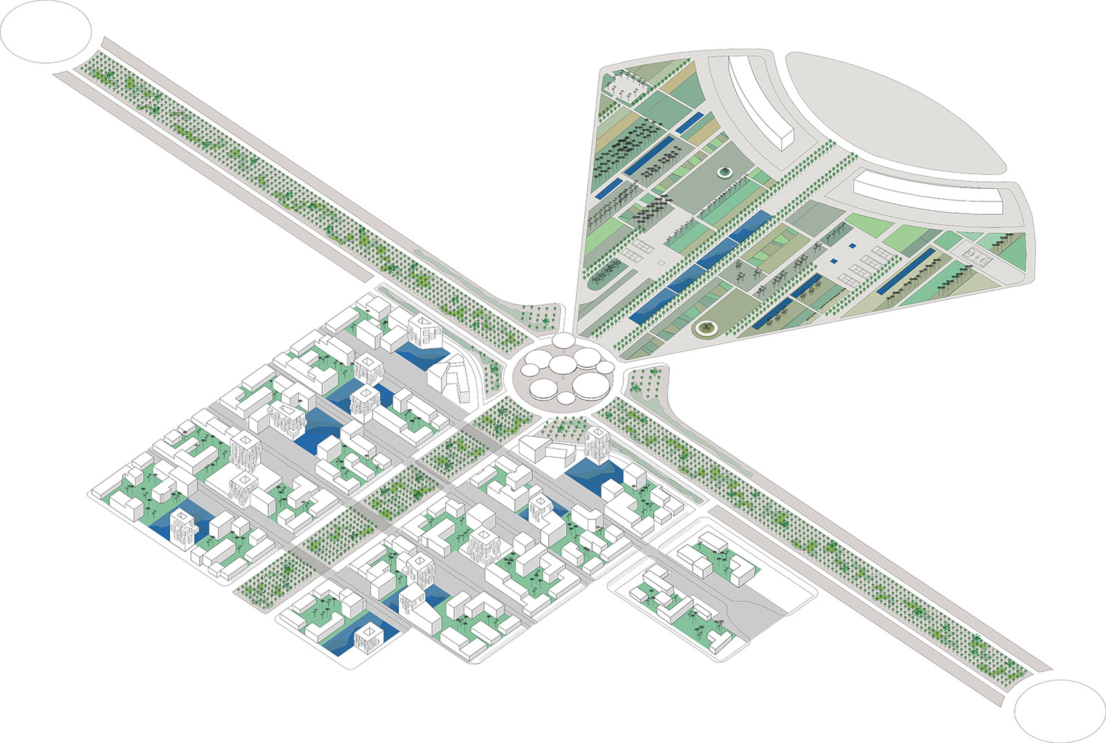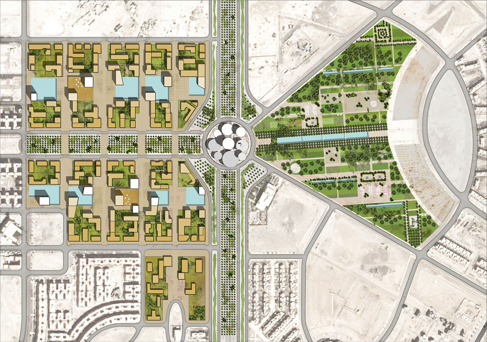 Thoroughly lacking any sense of character, this exurb of Marrakech is endeavoring to transform itself from a drear y bedroom suburb into a vital town with a strong sense of identity . Through the development of a series of interconnecting public spaces of different scales, this project creates a central public spine that fosters a sense of community for the town’s inhabitants. At the level of the urban block, the project proposes to op en the heart of traditionally closed city blocks in order to transform these previously inaccessible spaces into active destinations hosting public amenities and community activities. Opening the interior of the city blocks creates a porosity that prioritizes pedestrian and bicycle circulation. All of these open cores open onto a large ‘rambla’ that traverses the city center and connects to the large park at the city’s edge. At the city center , a circle of huge sculptural parasols serves as urban landmarks as well as creating a shaded plaza to host weekly farmers’ markets for the region